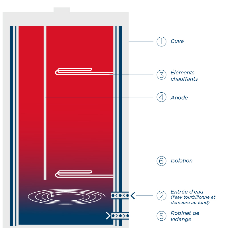 Le chauffe-eau à accumulation repose sur le principe de stratification thermique. L’eau chaude, étant moins dense et plus légère, reste en hauteur, tandis que l’eau froide, étant plus dense et plus lourde, reste au fond de la cuve. Les chauffe-eau standards, dont l’entrée d’eau s’effectue par le haut, viennent perturber l’équilibre eau chaude/eau froide; l’eau entrant du haut met de la pression vers le bas et renvoie ainsi l’eau froide vers le haut du réservoir créant une baisse de température et demandant plus d’énergie pour réchauffer l’eau. Le chauffe-eau HydroSolution, quant à lui, est doté d’une entrée d’eau froide par le bas, ce qui évite ce déséquilibre et permet d’avoir 10% plus d’eau chaude instantanément, évitant ainsi la vidange annuelle du chauffe-eau.